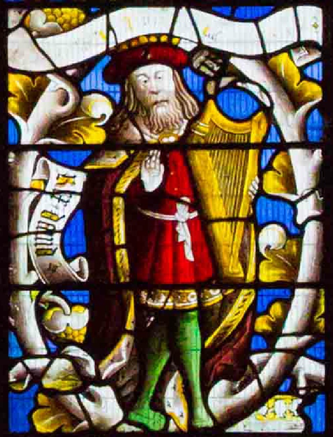 As one of the most important figures in the window, David occupies the central position and is shown as a complete figure (most of the others are demi-figures - without legs). His title of “Rex David” (King David) is shown on a scroll to his right, and as the psalmist, he is shown carrying a harp.