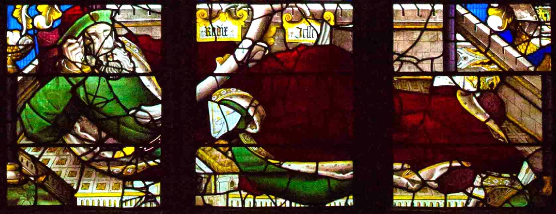 JESSE is the largest figure in the window, reclining across three of the bottom panels and is a visual representation of the ‘root’ of Jesse (eg Isaiah 11,10), King David’s father. Jesse features in a well-known story where seven of his sons are paraded before Samuel the priest who is charged with selecting the new King of Israel. As Jesse’s sons pass before him Samuel is told to look, not on the man’s appearance or on the height of his stature, ‘for the Lord does not see as mortals see; they look on the outward appearance, but the Lord looks at the heart’. None of these sons of Jesse is chosen, so Samuel says to Jesse, ‘Are all your sons here?’ Jesse replies, ‘There remains yet the youngest, but he is keeping the sheep’. Bishop John Davies